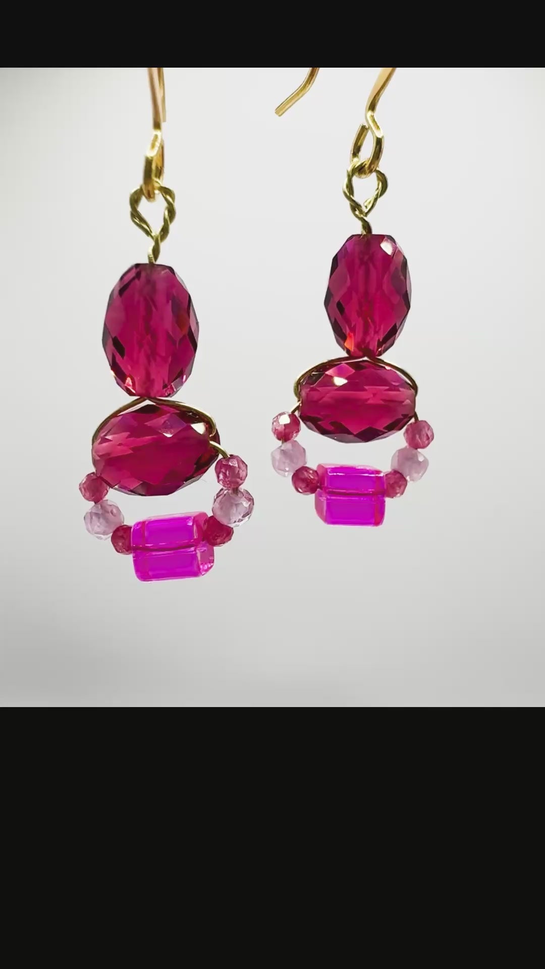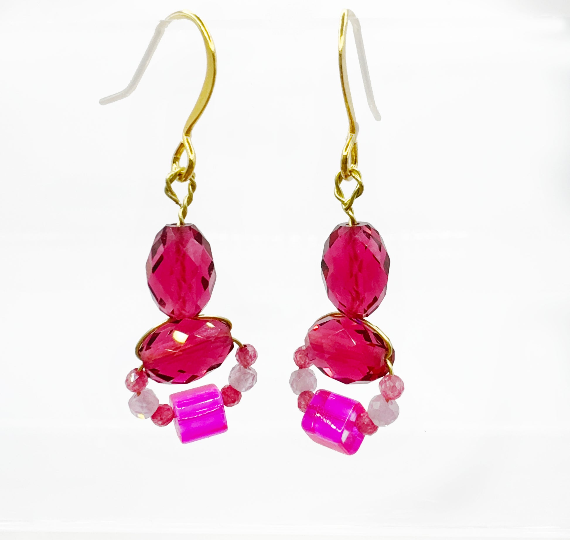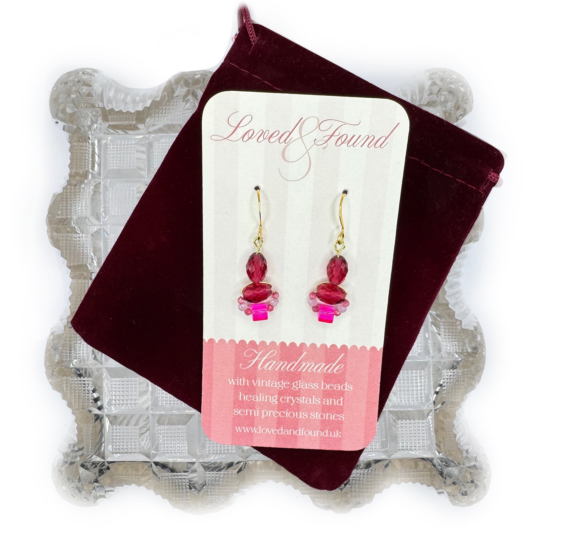 Pretty light-catching earrings, created from a selection of crystal beads in shades of pink, with a touch of fluorescent pink good measure. Hooks are 18carat gold plated.